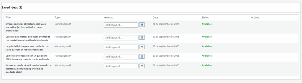 Generación desde ideas guardadas o temas libres